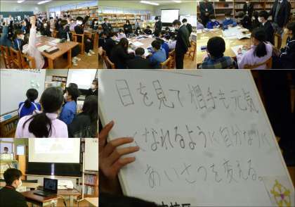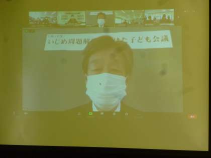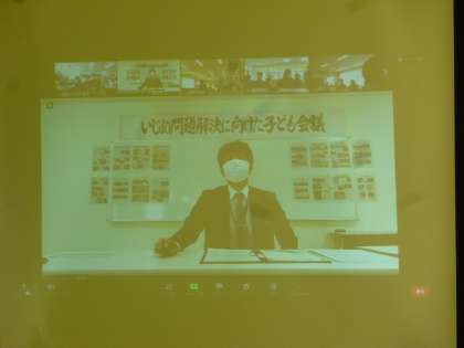 今年度のいじめ問題解決に向けた子ども会議は、各中学校区の中学校を会場に、各小中学校の代表者と市内各高校の代表者が一堂に会し、5つの中学校区をオンラインでつないて実施されました。