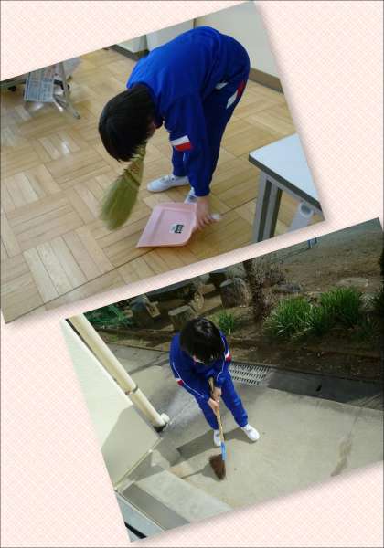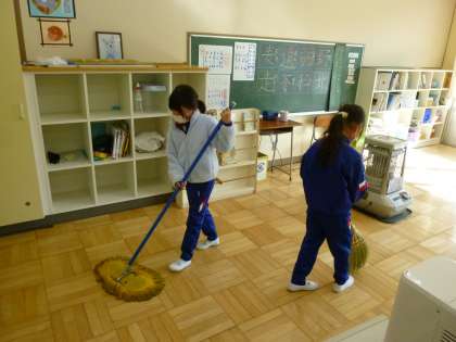 日野小の子どもたちは、実にしっかりと毎日の掃除に取り組みます。写真は2・3年生の掃除の様子ですが、掃き掃除もゴミ取りもモップ掛けもとても丁寧にやっています。自分の担当が終わると、できるところを見つけて積極的に活動します。他の教室に声を掛けて手伝ったりもします。こうした様子は4・5・6年生にも見られます。先生たちも、このような子どもたちを頼もしく思いながら、子どもたちの手の行き届かないようなところをやってくれています。