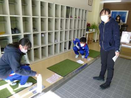 なお訓練終了後には、体育・保健委員の児童と先生とで、玄関の足拭き雑巾をきれいに片付けてくれました。
