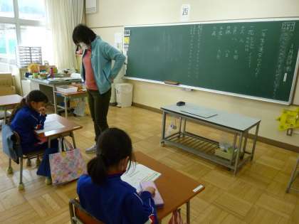 今日の授業では、はじめに「1年生の漢字なぞなぞ」をチーム対抗戦で楽しみました。そして、2・3年生とも鉛筆とフェルトペンを使って字を書く練習をしました。2年生は、文字の中心に気を付けて水、半、市、当の字を練習しました。3年生は、筆順のきまりに気を付けて小、内、申などの字を練習しました。