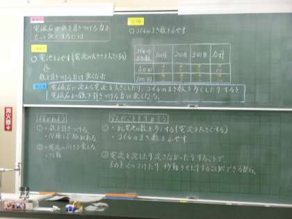 今日の授業では、「電磁石が鉄を引きつける力をもっと強くするには?」のめあてのもと、学習活動に取り組みました。これまでの学習では、電池の数を増やして強くしましたが、今回は「コイルの巻き数を増やせば」と予想し、実験装置を使って調べました。振り返りの場面では、ワークシートで学習内容の確認をし、定着が図られていました。