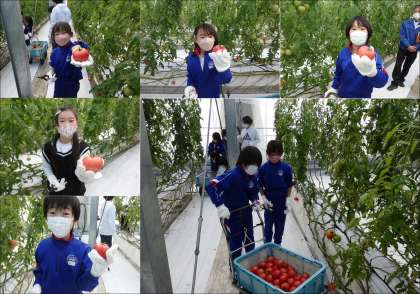 子どもたちは、大きなビニールハウスの中に何列ものトマトの苗がそびえ、大きく赤い実をつけている様子にびっくりしたようでした。ハウス内の白い箱の中にはたくさんのマルハナバチを飼っていて、受粉で大活躍するように快適な環境に整えられているのだそうです。トマトの生育や生産の時期、売られている店、美味しいトマトを作るための工夫など、子どもたちの質問の一つ一つに、農家さんは丁寧に答えてくださいました。実際にトマトの収穫体験もさせていただき、頑張ったからとお土産もいただいてしまいました。