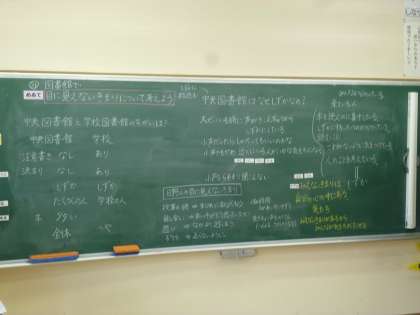 今日の授業では、資料『図書館で』を通して、目には見えないきまりについて考えました。資料に登場する図書館と日野小の図書館を比べると、資料の図書館にはきまりがありません。それでも“静か”なのはどうしてなのかという点に焦点を当てて話し合いました。そして、図書館に来る人たちが「人のことを考えている」からきまりがなくても大丈夫という結論に達し、見えないきまりは人の心の中にあるのだと気付きました。