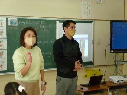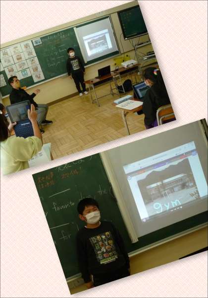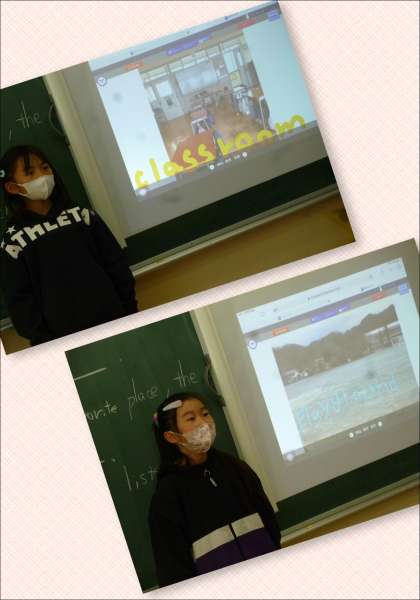 2月17日(金) 3・4年生外国語の授業(1) 公開日 2023/02/17 更新日 2023/02/17 できごと 今日の授業では、学校の中の好きな場所とその理由を発表することに挑戦しました。タブレットPCで撮影した場所をスクリーンに映し、発表する児童が「Hi」と手を振ると、聞き手の児童たちも「Hi」と手を振って応える姿は、何とも微笑ましいものでした。