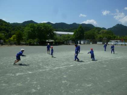 20分休み、校庭ではいつものように全学年入り交じってドッジビーを楽しんでいます。1年生もすっかり上手になりました。
