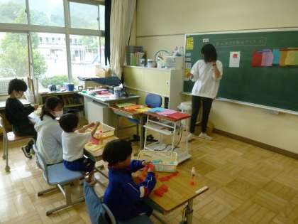 5月12日(金) 家族に「ありがとう」 公開日 2023/05/12 更新日 2023/05/12 できごと 1年生と4年生は来る母の日に向けて、ありがとうの気持ちを伝える素敵な手紙作りに取り組みました。きれいな色の和紙をちぎり、寄せたり重ねたりしてカーネーションの花にして台紙に貼り、これまで一生懸命勉強してきたひらがなで感謝の気持ちを書く計画です。 先生たちに教わりながら、好きな色の紙を楽しそうにちぎる子どもたち。きっと、気持ちのこもった温かい手紙となることでしょう。