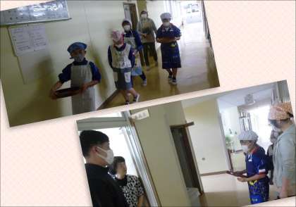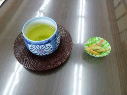 自分たちの入れたお茶を職員室にも持って来てくれました。「新茶の良い香りがする」「やわらかく、まろやかな味わい」「とても美味しい」「お茶うけまで付けてくれて!」と、先生たちも大絶賛でした。昨年度家庭科を指導した先生も、嬉しそうでした。