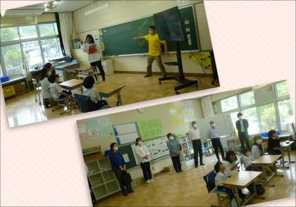 写真上は、1年生と4年生の外国語活動の授業です。ALTの先生や担任の先生たちと、英語であいさつしたりゲームをしたりして、とても楽しく活動している様子を見ていただきました。
