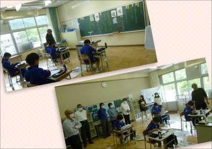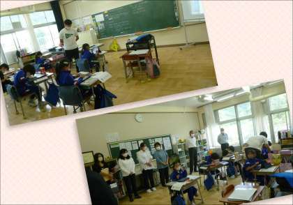 写真下は、5・6年生の書写の授業です。5年生は「道」を、6年生は「湖」を毛筆で練習していました。どちらの学年も文字の組み立てを意識して書きますが、5年生は中と外、6年生は3つの部分というように、学年により習得内容が違います。複式の指導の様子や真剣に活動に取り組む様子を見ていただきました。