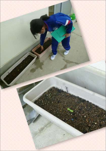 また、花壇で育てたキャベツの葉に付いたモンシロチョウの卵を見つけ、容器に移して観察していく準備をしました。