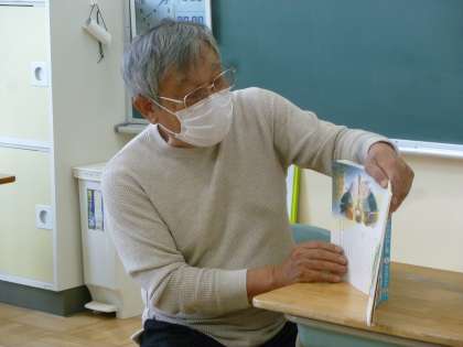 下学年の読み聞かせの様子です。ボランティアさんは、何年もご協力いただいているベテランさんです。それでも、本校に通うお孫さんから「絵がある本の方がいいよ」「絵が見えるように。こんなふうに読んでね」とアドバイス(注文)が出るんですよ、と嬉しそうに話してくださいます。お孫さんのアドバイス通り、素敵な絵のある物語を選んで丁寧に読み聞かせてくださいました。