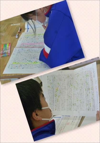 5月16日(火) 6年生国語の授業 公開日 2023/05/16 更新日 2023/05/16 できごと 6年生は、教材「時計の時間と心の時間」の学習に取り組んでいます。今日の授業では、筆者の主張と事例に気を付けて説明文を読み、文章構成を再考する活動に臨みました。 児童のワークシートを見ると、読み取ってわかったことなどをマークしたり書き込んだりしていることが分かります。そうしたことをもとに、児童と先生とで意見を交わしながら、めあてへと真剣に向かっていく姿が見られました。