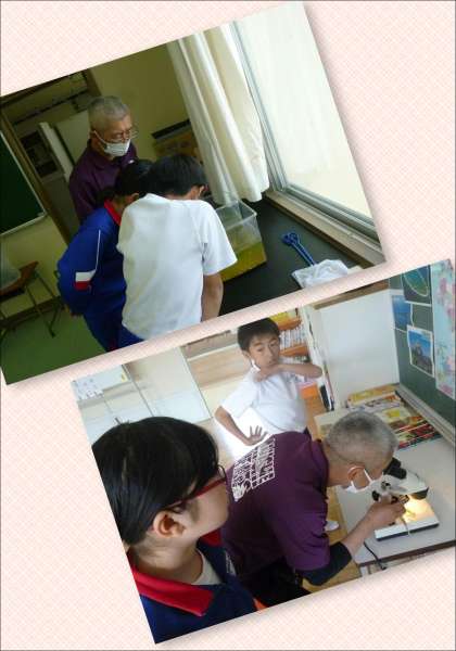 写真上は、5年生が理科の授業でメダカの卵を観察しているところです。昨日の休み時間に、理科の先生と5年生が大事に育てているメダカが産んだ卵に変化があった、と教えてくれました。顕微鏡をのぞくと、小さな透き通った卵に小さな黒い目が見えました。まもなく誕生ですね。