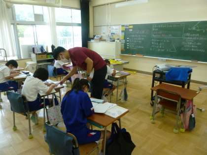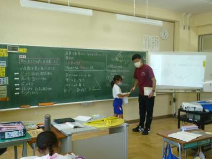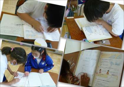 5月18日(木) 4年生算数の授業 公開日 2023/05/18 更新日 2023/05/18 できごと 4年生は、角度についての学習を進めています。分度器を初めて手にし、どのような計測器なのかを調べ、様々な角度の測り方を考えました。子どもたちは、角度を測るコツを掴むと、「もっと測りたい!」と意欲的に練習問題に取り組みました。
