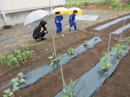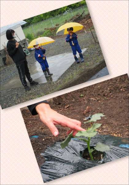 1年生は、生活科の授業で育てていく畑の野菜の様子を見に行きました。あいにくの雨となりましたが、ワクワクしながら畑に向かいました。すると、前に見た様子と違うことに気付き、来週のサツマイモの苗植えのために業務員さんが準備してくれたことを知りました。