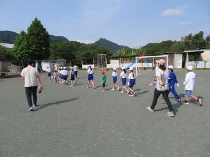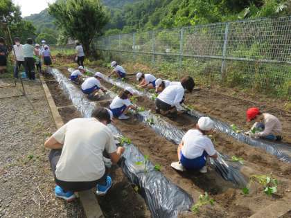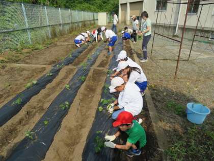 5月22日(月) さつまいもの苗植え 公開日 2023/05/22 更新日 2023/05/22 できごと 今日の業前活動は、全校でさつまいもの苗植えを行いました。まずは体育館裏の畑へ移動し、みんなでさつまいもの苗を植えました。上級生が下級生の面倒を見ながら、スムーズに植えることができました。最後に畑の準備をしてくださった業務員さんにあいさつをして終わりになりました。秋には収穫をし、焼きいもにしてみんなで食べる予定です。今からとても楽しみです。