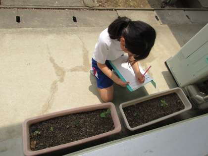 授業の最後には、教室の前のプランターにまいた様々な野菜の成長の記録をとっていました。