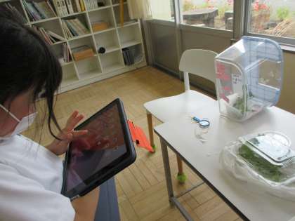今日は、「また1匹チョウになりました!」と3年生が知らせに来てくれました。飼育かごの中を見ると、2匹のモンシロチョウが元気に飛び回っていました。3年生は、しっかりと観察した後、校庭に飛び立たせてあげました。