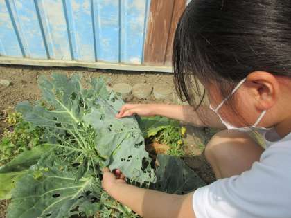 3年生の周りには、先ほど放ったチョウ以外にも数匹のモンシロチョウが飛んでいます。花壇に植えたキャベツをじっくり見ると、まだたくさんの幼虫やサナギが見つかりました。