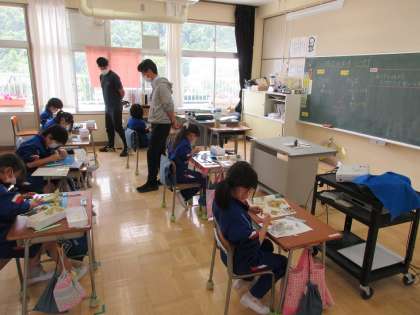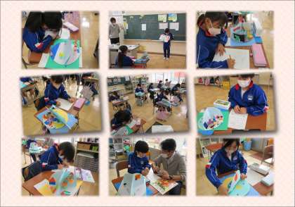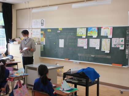 はじめに、これまでの授業で描いた絵の発表と、その鑑賞を行いました。子どもたちは一人一人前に出て、自分が頑張ったところや工夫したところを説明しました。聞き手の子どもたちはそれを見聞きして、鑑賞シートに感想などを書きます。絵を通して、互いの良さを感じ取り、認め合う良い機会となりました。