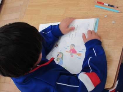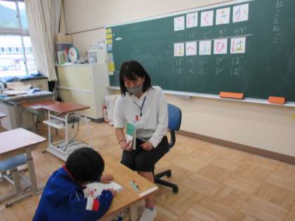 「ねことねっこ」の学習に取り組む1年生。今日の授業では、「おばさんとおばあさん」の学習に取り組んでいました。言葉の途中に小さな「つ」など一文字入ると読み方が変わり、意味も全く変わることを、一生懸命学んでいる途中です。