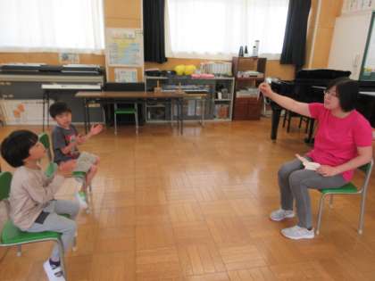今日の授業では、先生の提示する絵を見て、その言葉を言いながら手拍子を打つ活動に取り組みました。「エビフライ」や「さつまいも」など、言葉もはっきりと手拍子もしっかりとしなければなりませんが、1年生はとても上手に行うことができました。先生にほめられ、さらに張り切る様子が見られました。