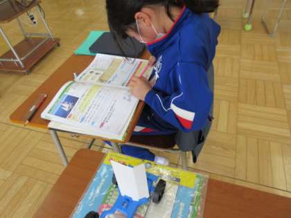 3年生は、風の強さと風の力で動く車の進む距離の関係について、実験用の車を使って調べました。これまでに、ゴムの力と車の進む距離の関係を学習してきているので、「強い風が吹くと進む距離は長くなる」と予想して、実験に取り組みました。結果をもとにまとめをする場面では、めあてと照らし合わせながら、子どもの言葉を生かす様子が見られました。