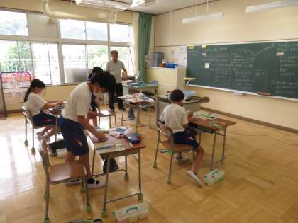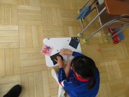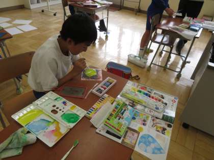 今日の1・2時間目は図工でした。「心のもよう」という単元で、まずは、数枚の小さな画用紙に絵の具を使って自分の思うままに模様を表現しました。それが仕上がった後は、その模様の画用紙を大きな画用紙に自分の好きなように配置して作品をつくりました。今回は色々な道具を使いながら自分の思いを表現することができました。