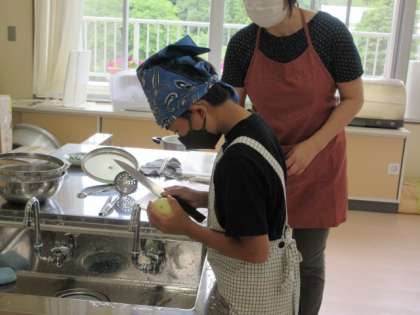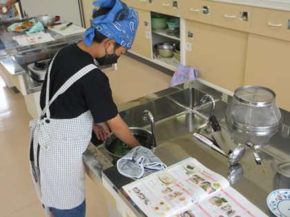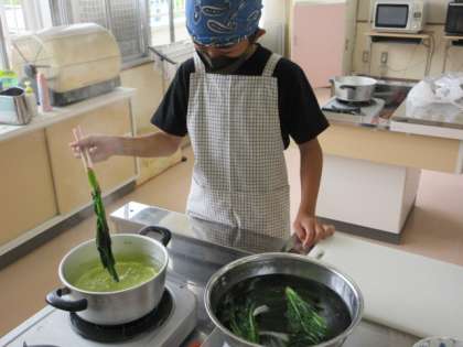 今日の授業では、5年生は初めての調理実習で“ゆで野菜”に挑戦しました。ほうれんそうを色よくゆでて流水にさらしたり、ジャガイモの皮をピーラーでむいて包丁の角で芽の部分を取り除いたりと、2つの調理に慎重に取り組みました。