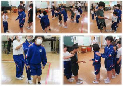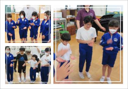 三つ目は、皆で輪になり、先生の拍打ちに合わせて両隣りの人と手を打ち合う活動をしました。先生のかけ声により、左手の平を上に向けていたのを下に変えるなど、少し手こずりましたが、さすがは柔軟な子どもたち、すぐに慣れて上手に楽しく活動することができました。