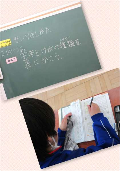 1年生は、算数として教室に並べた梅の実の数を数え、教えてくれました。4年生は、梅の収穫を喜びながら、算数の「整理の仕方」のプリントに意欲的に取り組みました。