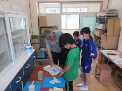 5・6年生は、電動糸のこぎりの使い方を学習しました。刃の向きと取り付け方、機械に向かう姿勢や板の押さえ方を学び、実際に板を切ってみました。板に垂直に刃が当たるようにしようと心掛けても、なかなか思うように行かない場面もありましたが、先生の助言を受けながら真剣に練習し、直線をはじめ曲線も切ることができるようになってきました。