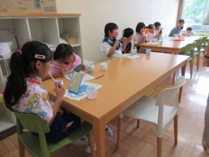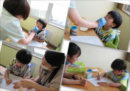 給食後にいつものように歯みがきをしている子どもたちですが、歯垢の染め出し体験を通して自分の歯みがきの課題に気付くことができました。1年生も、鏡を見ながらしっかりと色が付いている箇所をプリントの絵に塗ることができました。