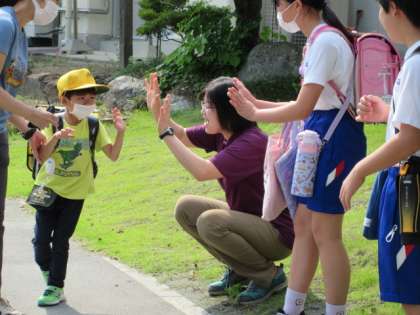 そして、月曜日恒例のスマイルハイタッチをして、元気にそれぞれの帰路へとつきました。明日も元気に登校してくる子どもたちを、職員一同楽しみに待っています。