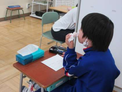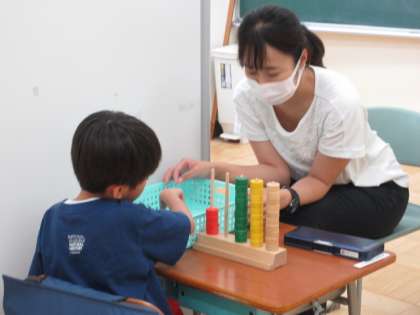 今日の授業では、1年生は写真のような道具を使って数の学習に取り組みました。一本の棒に積み木が10個で10から始まり、大きな数のこともつかんでいきました。4年生は、プリントを使って計算問題に取り組みました。黙々とよく集中して、真剣に計算していました。
