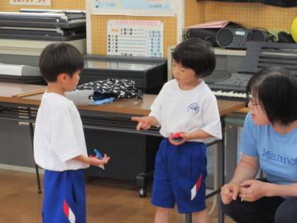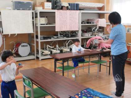 1年生は、曲のリズムをつかむこと、リズムに乗ることができるようにと毎時間頑張っています。今日の授業では、カスタネットを使い、音楽に合わせて上手にたたく様子も見られました。音楽に合わせてのジャンケンもバッチリでした。