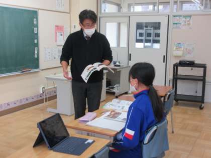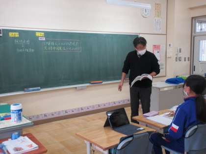 今日は教頭先生による授業です。大日本帝国憲法をつくった伊藤博文の思いについて、教科書や各種資料をもとに考えていきました。児童ははじめ緊張した様子でしたが、教頭先生の丁寧な説明や助言を受け、意欲的に調べ考える様子がうかがえました。