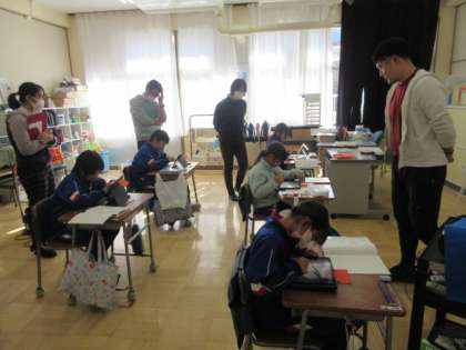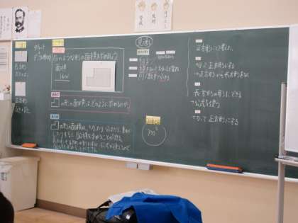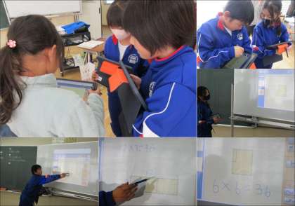 4年生は、面積の学習をしています。今日の授業は校内研修の一環として行われ、先生方にも参観してもらいました。黒板に問題を提示し、いつものように子どもたちの声を生かしためあてが掲げられました。階段型の図形の面積をどうやって求めるのか各自で見通しをもち、問題解決場面ではデジタル教材を活用して考え、互いの考え方を小グループで説明し合いました。デジタル教材を使い、階段型の図形を二つに分けてそれぞれを計算してたすなどして、子どもたちは様々な考えをもちました。互いの考えを視覚的に共有し、説明を聞き、自分よりもっと簡単な求め方があることに気付くなど、ICTが効果的に活用されていました。