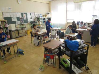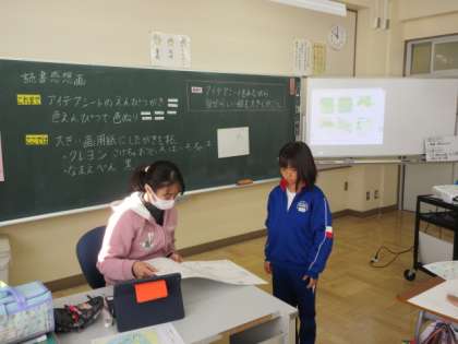 12月7日(木) 3・4年生図工の授業 公開日 2023/12/07 更新日 2023/12/07 できごと 3・4年生は、読書感想画に制作に取り組んでいます。今日の授業は、アイデアシートを見ながら自分らしい絵を大きく描くことがめあてです。子どもたちは自分で選んだ本の内容の一場面を、クレヨンや名前ペンなどを使って画用紙に真剣に下描きし、先生にチェックしてもらっています。物語の世界の一場面をどのように描くのか、とても楽しみです。
