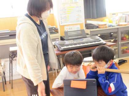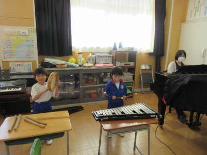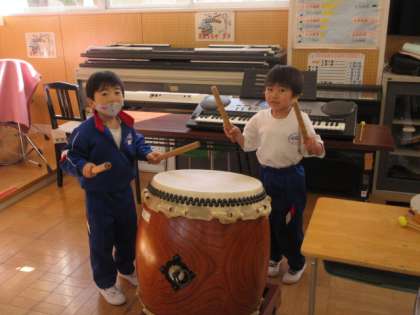 1年生は、2学期最後の音楽集会で発表するため楽器の演奏練習に取り組んでいます。一つ目は「きらきらぼし」です。それぞれ鉄琴とタンバリンを担当し、関心をもって練習しています。その成果があらわれてとても上手に演奏することができ、二人の息もよく合ってきています。二つ目は、“日野小かえる太鼓”による太鼓の演奏です。名前は自分たちでネーミングし、演奏もほぼ即興です。演奏前の拍の取り方を先生から教わったり、曲の最後に二人で跳び上がってたたくことを話し合ったりし、発表に向けてとても意欲的に頑張っています。