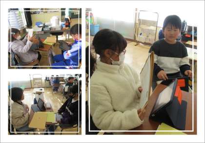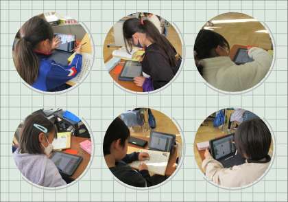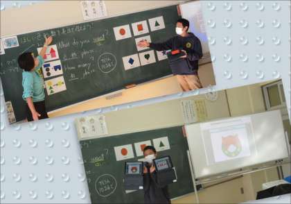 今日の授業では、「ほしい色・形・数を英語で伝えよう」というめあてをもって学習しました。これまでの授業で、子どもたちは様々な色・形・数の英語でのいい方を学習してきています。これらのことを活用し、What do you want?→色・形,please.→How many?→数 please.と対話ができるようにします。先生たちが示してくれたお手本をもとに、子どもたちはタブレットPCでクリスマスツリーやリース、プレゼントなどを、丸や四角、ハート型や星を使って作成します。グループワークでは、英語の対話をしながら友達の絵を当て合います。先生たちの工夫のおかげで、子どもたちはとても楽しそうに活動することができました。