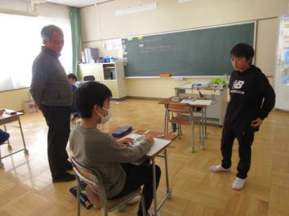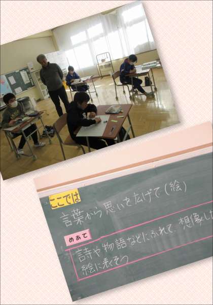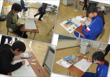 5・6年生も、読書感想画の制作に取り組んでいます。本を読み、物語の中の言葉から想像したことを絵に表します。想像の手がかりとして本の表紙や挿絵を参考にしているようですが、「ボールを蹴るところを描きたいが、難しい」と悩んでいる6年生に対して、サッカーをやっている5年生がポーズをとったりアドバイスを送ったりする場面もありました。構図や色などに大いに想像力を発揮して完成させ、絵を見た人を楽しませてほしいと思います。