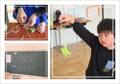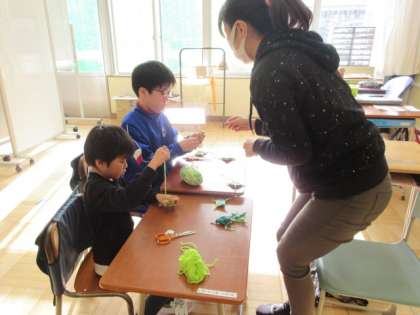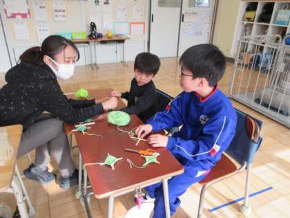 半分の長さの割り箸に、規則性をもって毛糸をくるくると巻き付けていきます。指先を使う細やかな作業なので最初は先生の補助が必要でしたが、やり方を覚えると次第にスムーズに作ることができるようになりました。仕上がりもとてもきれいです。先生たちに自分の気持ちがしっかりと伝わることでしょう。