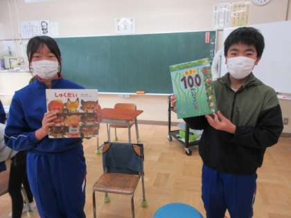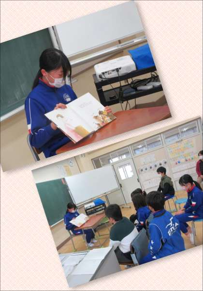 一人目の6年生は『ぬまの100かいだてのいえ』を、二人目の6年生は『しゅくだい』を取り上げました。100かいだてのいえシリーズの「ぬま〜」は、沼で暮らす様々な生き物が登場し、主人公と力を合わせて頑張る温かなお話です。6年生は、やさしく語りかけるように読んでくれました。「しゅくだい」は、子どもたちにもなじみのある温かな絵とともに6年生が穏やかに丁寧に読んでくれて、愛情溢れる家族の様子が伝わってきました。