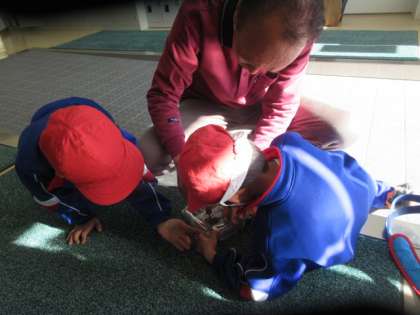 渡り廊下でサワガニを見つけた1年生。しばらく見ていたいということで、先生方に入れ物を探してもらい、業務員さんには蓋に穴を開けてもらい、ちょうど良い水の量も教えてもらいました。小石も入れて、カニが水から上がれるようにもしました。