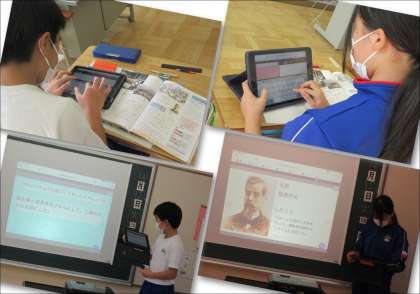 12月12日(火) 6年生社会の授業 公開日 2023/12/12 更新日 2023/12/12 できごと 今日の授業では、不平等条約の改正のため政府はどのような努力をし、その結果、国民の生活がどのように変わったのかについて調べました。産業の近代化や外国との交渉など、目指す国づくりに向けていくつもの困難を乗り越えてきたことを知った6年生は、タブレットPCにまとめて発表しました。板書をノートに書き、タブレットPCに授業のまとめや振り返りを蓄積するなど、工夫された活動が見られました。