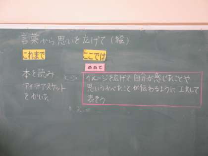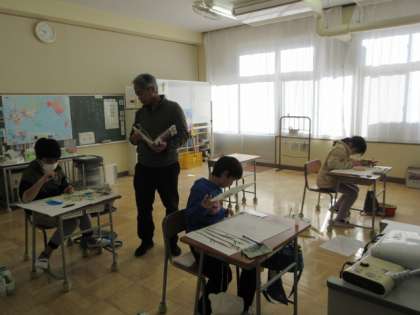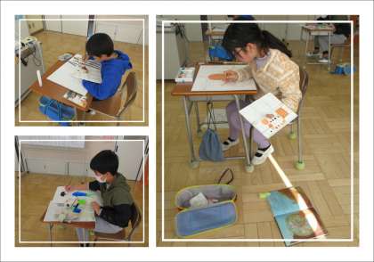 高学年児童も、読書感想画の制作に取り組んでいます。本を読み、自分が感じたことのイメージを広げて工夫して描くことをテーマに掲げ、集中して色塗りをしていました。中学年同様、ペンやクレヨンなどと絵の具のバランスなどを考え、先生に助言を求めるなどして着々と進んでいます。