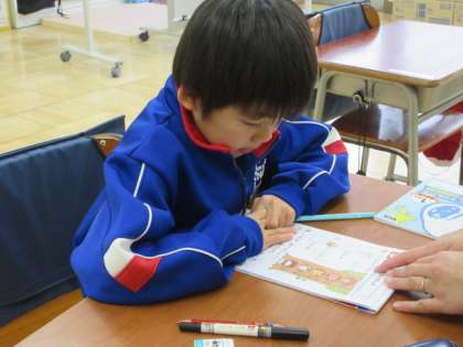 今日の授業では、算数ドリルを使い、たし算や数の大小、前から何番目などの学習に取り組みました。毎日コツコツと頑張ってきたことにより、今ではブロック操作などをせずに問題を読んで答えを導くことができます。丸を付けてもらった1年生は、張り切って次の問題に進みました。
