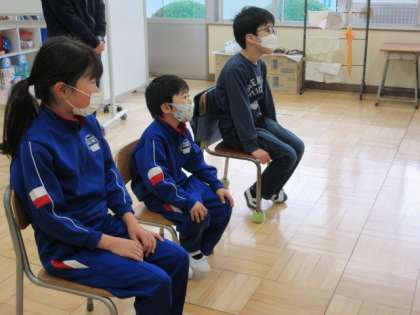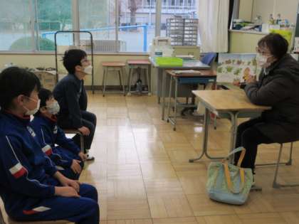 1・3・4年生へは、『うんたろさん うんちどろぼうのひみつ』『サンタさん ありがとう〜ちいさなクリスマスのものがたり〜』を読み聞かせてくださいました。『うんたろさん〜』は、ボランティアさんお薦めのとても楽しいお話で、以前に1年生とも約束をしたのだそうです。うんち研究家という設定が面白く、様々な動物のうんちを巡る話を通して動物の生態まで分かります。子どもたちは皆、目を見張って聞き入っていました。
