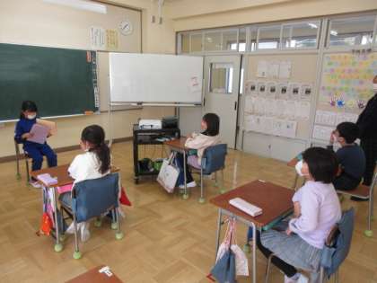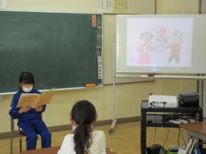 3年生は、4年生や先生たちに国語の学習成果を発表しました。一つ目は、「三年とうげ」の学びから考案した「○○の昔話」です。むかしむかし…から始まり、最後の結びまで展開を全て考え、登場人物の会話も織り込んで、温かく楽しい内容に仕上げることができました。場面ごとの絵や読み方にも工夫が見られました。